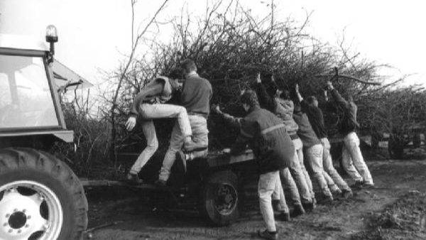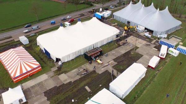 De volgende dag om zes uur ’s morgens waren de tentbouwers uit Valkenwaard al weer op weg naar Bentelo. Om negen uur waren zij aanwezig. Alle materialen stonden op tien platte wagens al klaar. ’s Middags om vijf uur stond de tent weer: klaar voor gebruik. Wat we normaal in drie dagen doen, lukte het ons door de goede inzet van 60 helpers op één dag!